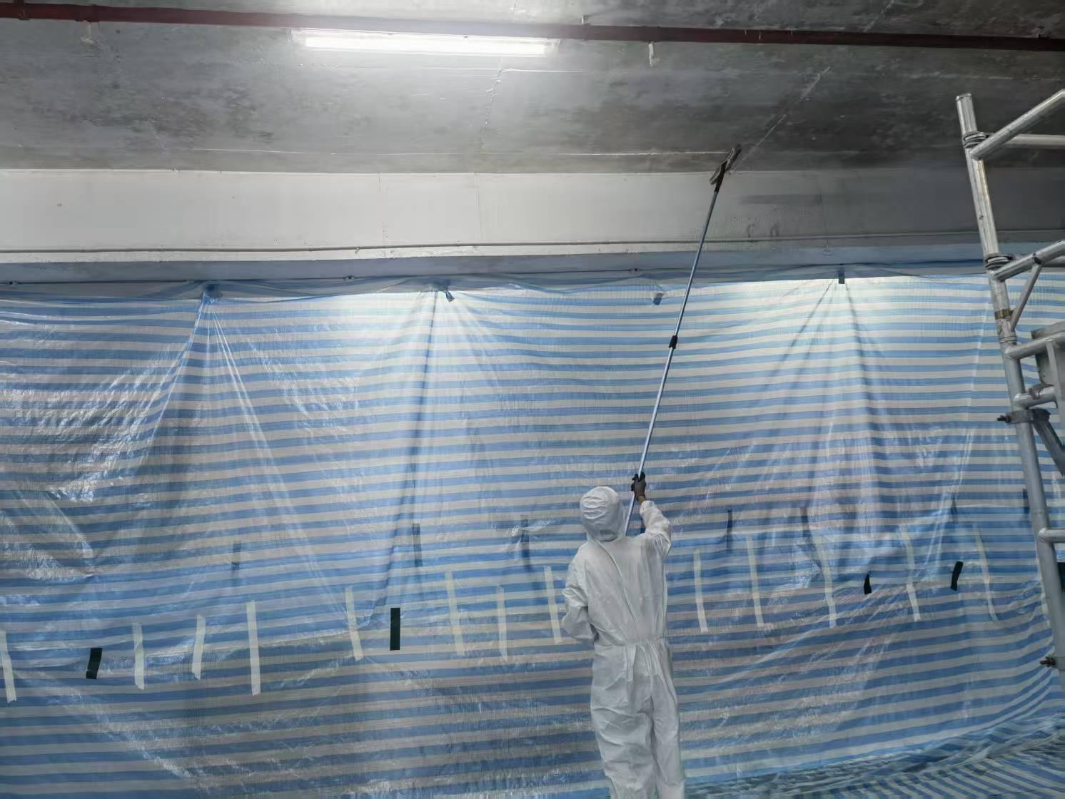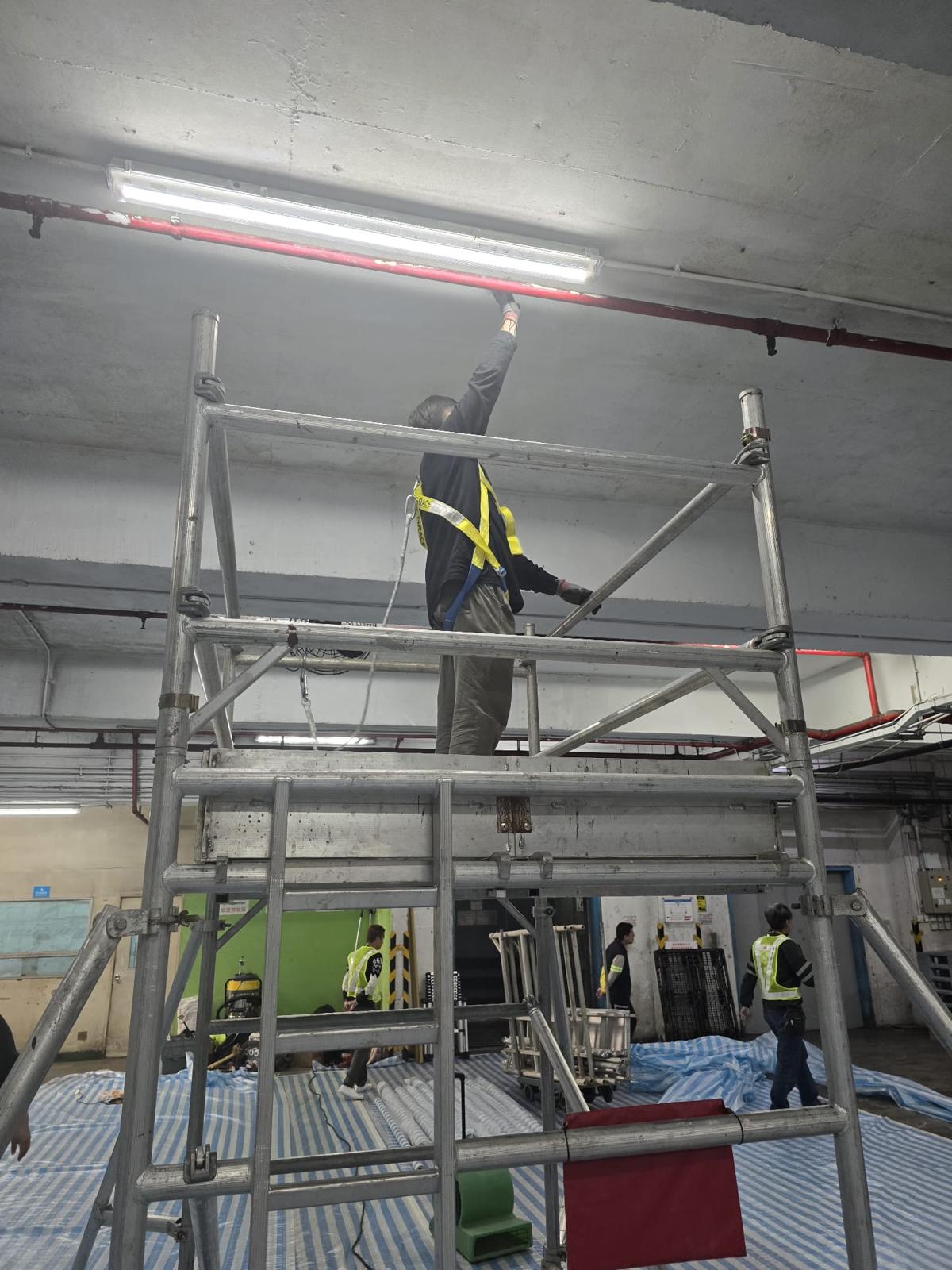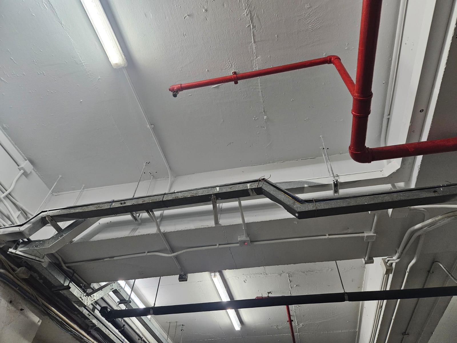 - Surface prep: Localized cleaning to remove dust, loose particles, and any residues; masking of luminaires and sprinkler heads; light mechanical abrasion where needed.